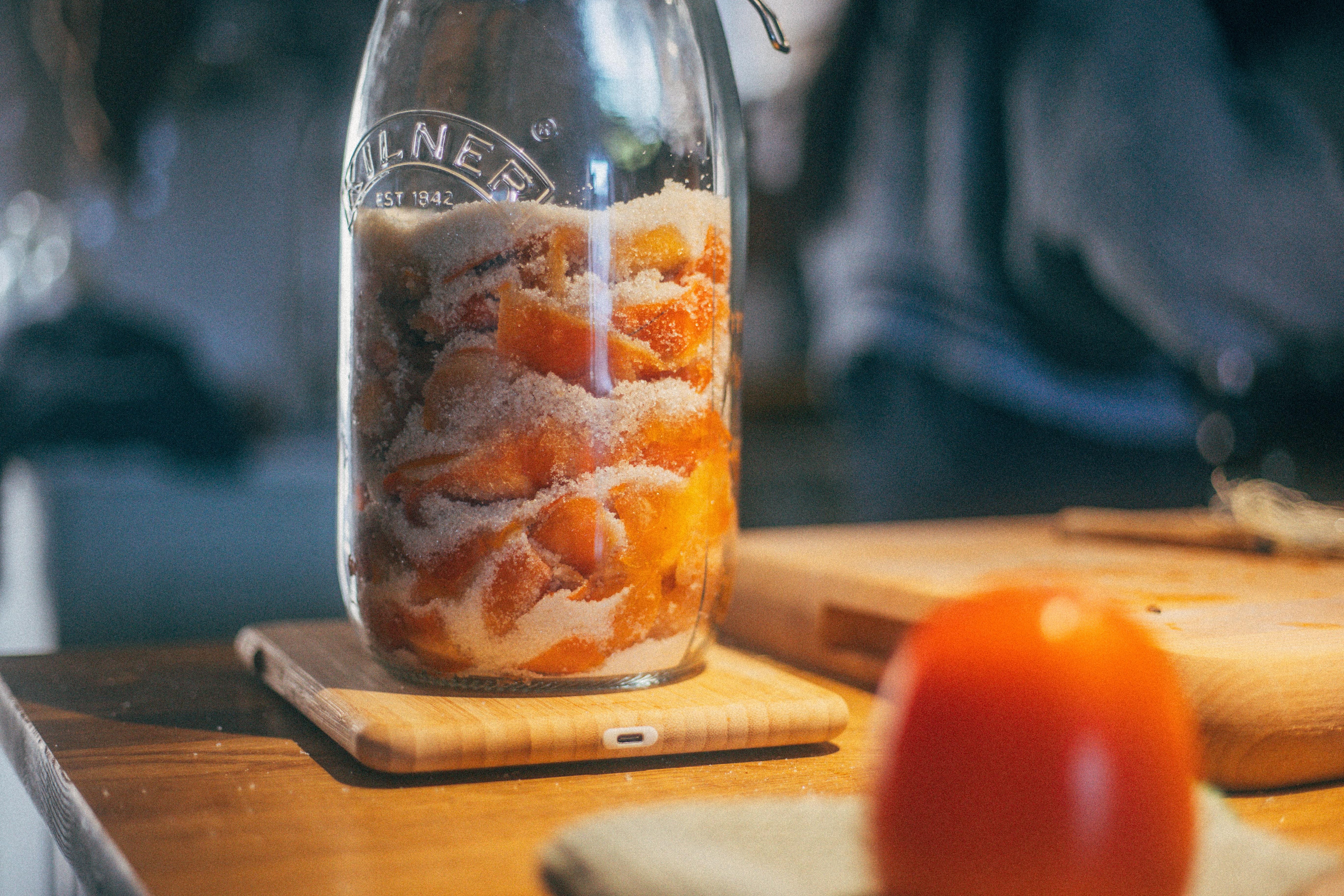 Loosely toss the fruit and sugar together in a bowl then add them to the jar. Start with a handful of sugar, then a layer of persimmon. Repeat until finished, then end with a generous cap of sugar on top (this helps discourage surface growth).