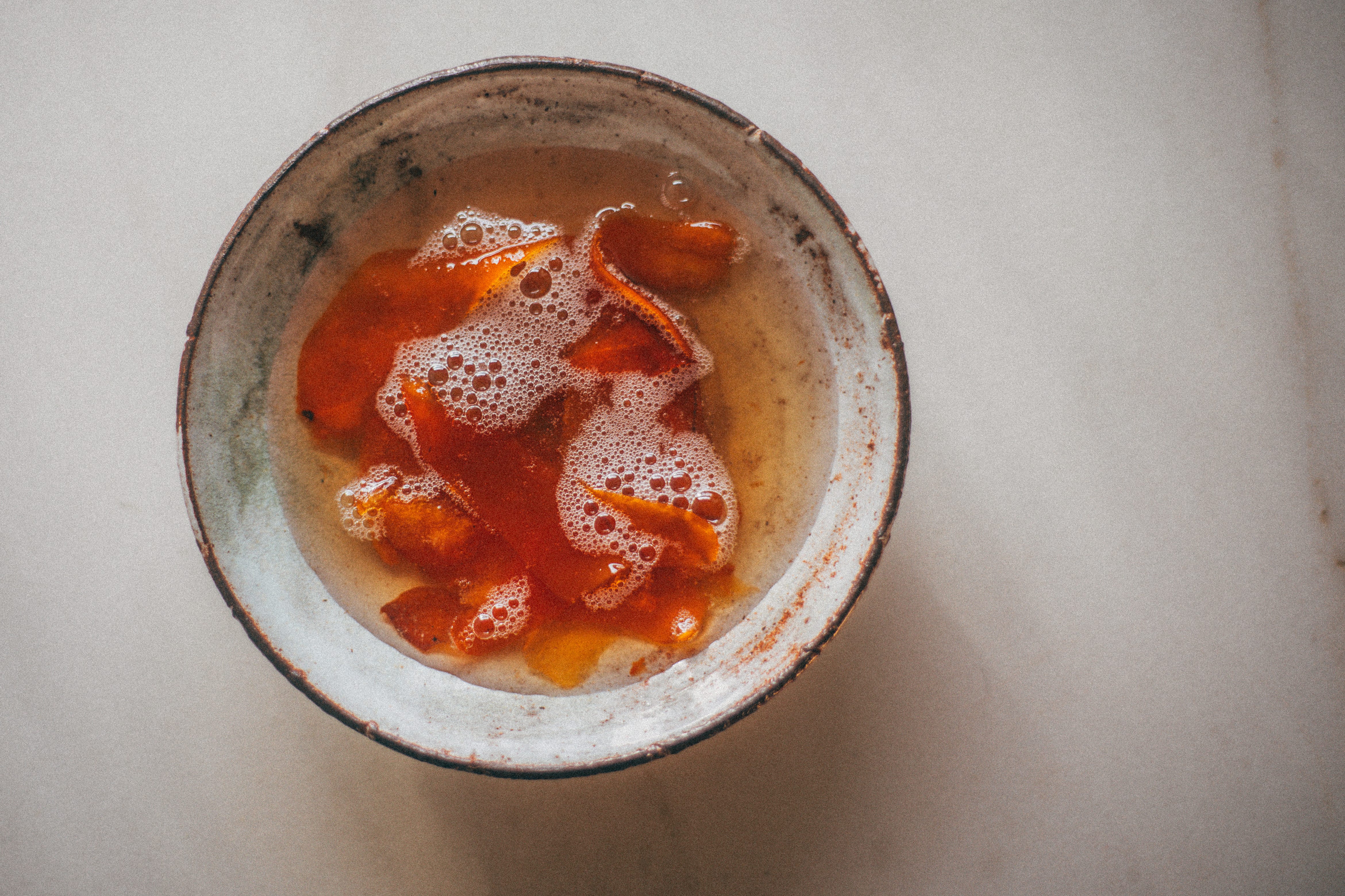 At the end of this article, I’ve included some interesting ways to use the cheong, but if you want to experience it directly, mix 1 teaspoon into a cup of hot water and sip as a tea. For this persimmon cheong, I highly recommend also infusing a piece of ginger root and lemon rind, and for the adventurous, a sprig of bruised verbena.