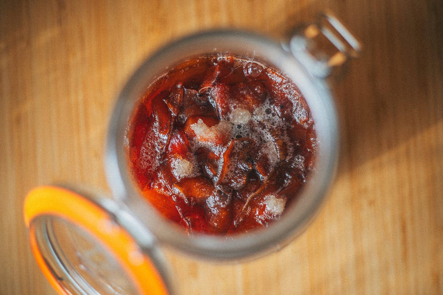 You’re aiming for most of the sugar to be dissolved, the fruit to be suspended in a thick syrup, and the whole thing to have a clean, fruity aroma. Small bubbles will appear once ambient temperatures rise again in spring to above 18°C. This is the slow fermentation starting to kick in.